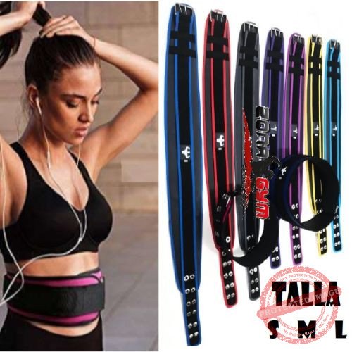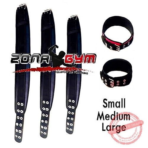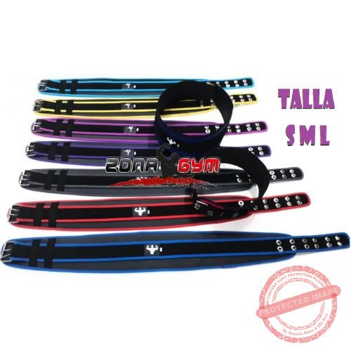Cinturón deportivo con hebilla metálica para entrenamiento en gimnasio. Ofrece soporte lumbar ajustable durante levantamientos pesados. Disponible en varios colores y tallas Small, Medium y Large.