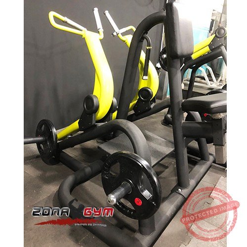 Máquina Hammer de espalda profesional. Tubería reforzada, compatible con discos olímpicos, tapizado cómodo.